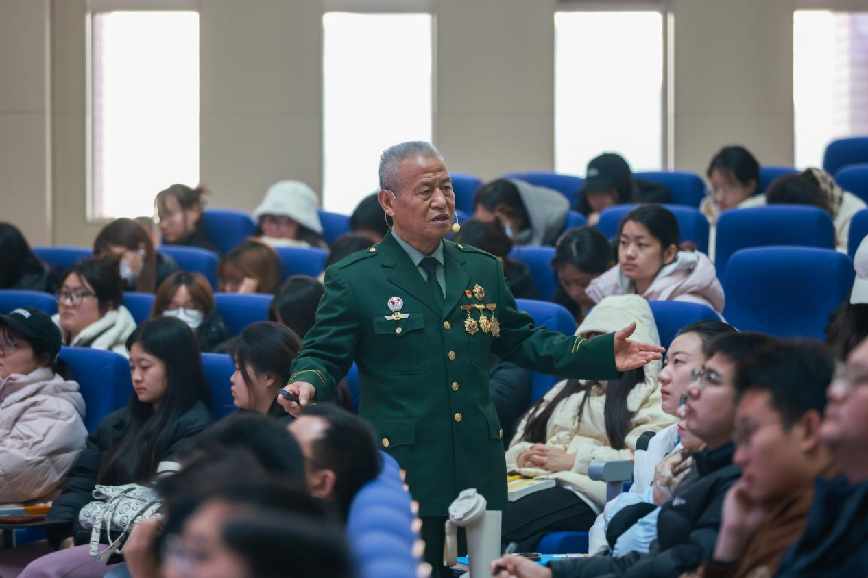 许玉亭同志以“弘扬伟大抗战精神,为实现强国建设、民族复兴伟业而奋斗”为主题,通过鲜活感人的故事,生动讲述了在艰苦卓绝的抗战岁月中,中国共产党带领中国人民以不屈意志和英勇抗争凝聚形成的伟大抗战精神,以及在这一精神激励下取得的辉煌成就。他结合自身参军报国、服务地方、退休后持续投身红色宣讲的丰富经历,激励青年学子赓续英雄血脉,传承强国之志,将个人理想融入国家发展与民族复兴的伟大事业。